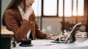 Justice and law concept. Female judge in a courtroom with the gavel working with digital tablet computer docking keyboard on wood table.
